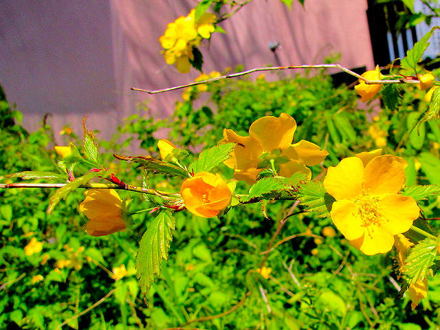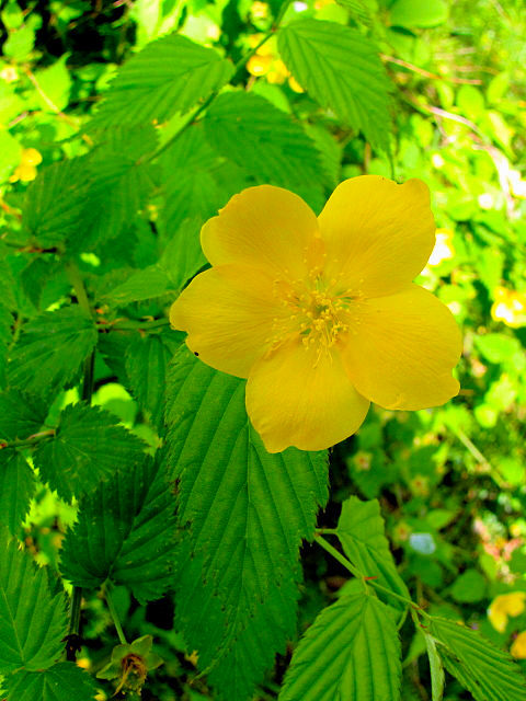 一方、ヤマブキの場合は低木だから、その立ち姿は舞妓さんの日本髪を見る思いがする。 花は、その髪飾りのようなものだろう。 あでやかな、大きなかんざしがお似合いだ。