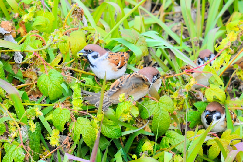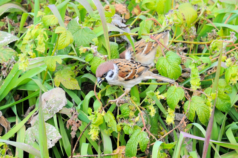 | 今は、若葉や草の実といった食べものも十分あるだろうが、それも次第に食べ尽くしていくに違いない。これから春先まで寒さに弱いスズメ達には試練の季節でもあろう。 |