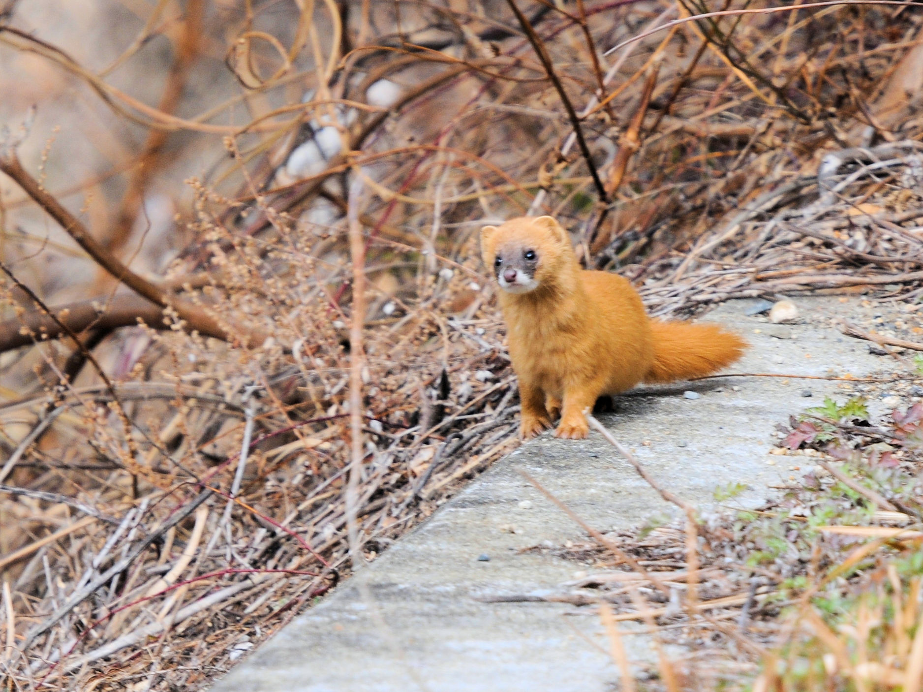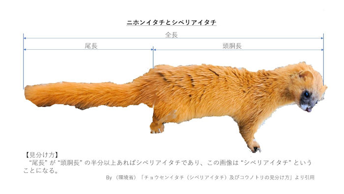 日本で見かけるイタチは“ニホンイタチ”または“シベリアイタチ”の二種というので調べて見た。その見分け方は環境省によると尾の長さでわかるとのことであった。それによれば写真はシベリアイタチということになる。