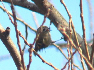 右の写真は、アップに耐えないからと、恥ずかしがってはいるが、キクイタダキの特徴である、二本の翼帯と、頭頂の黄色線が確認できるものである。