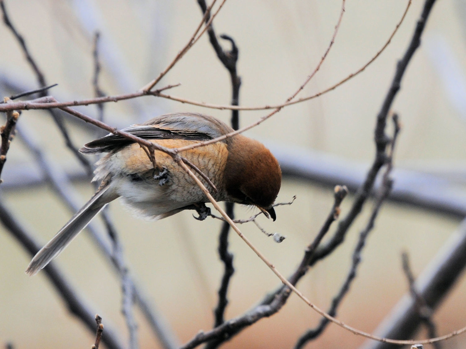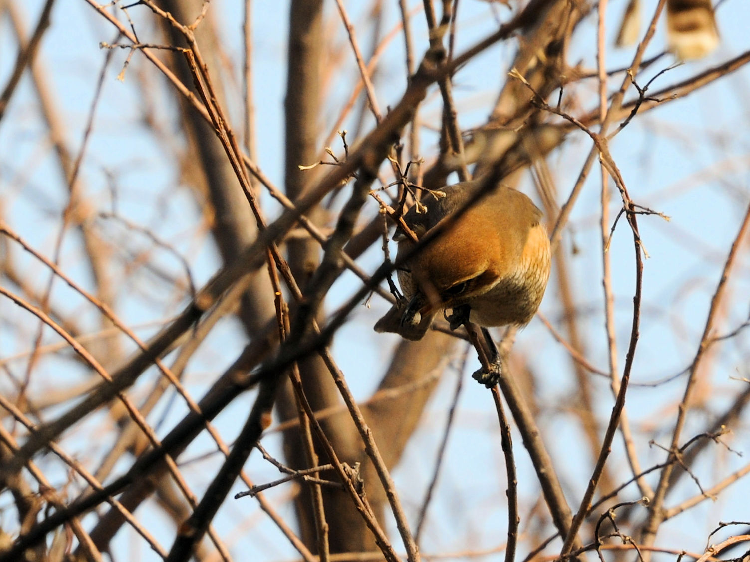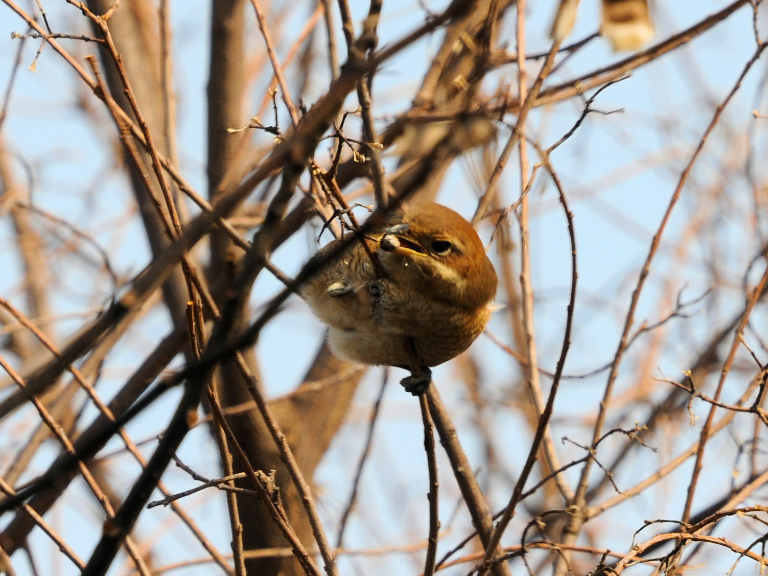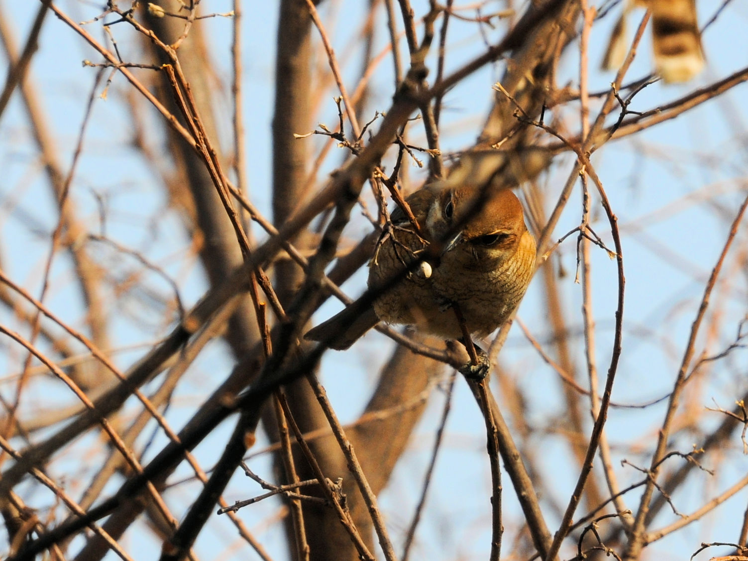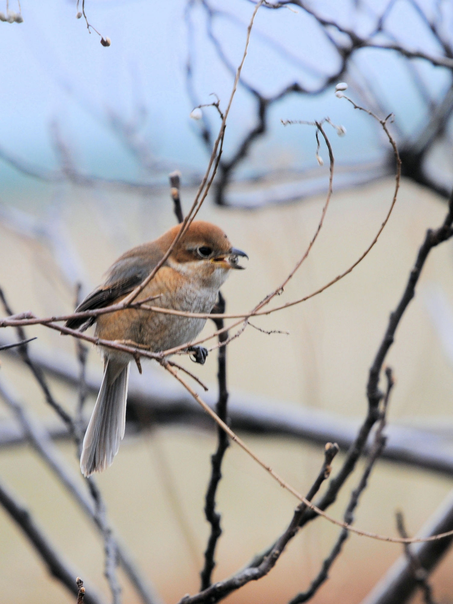 “モズの食性” は、主に昆虫やカエルやトカゲといった動物を捕食するのだが・・・冬場ではいづれも姿を消す。また、貯蔵した “早贄 はやにえ” も食べ尽くしたのか木の実を食べていた。初めて見る行動だ。