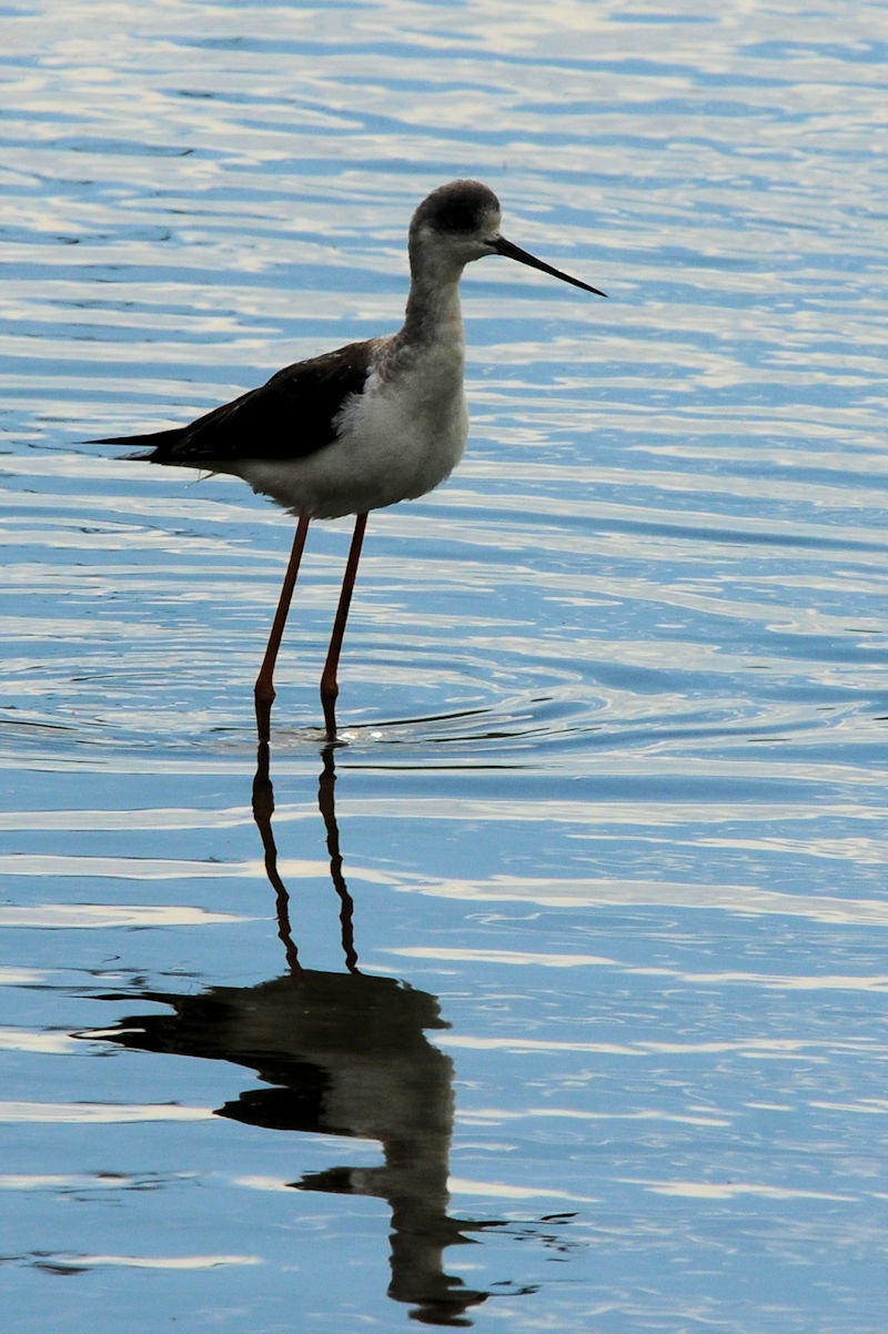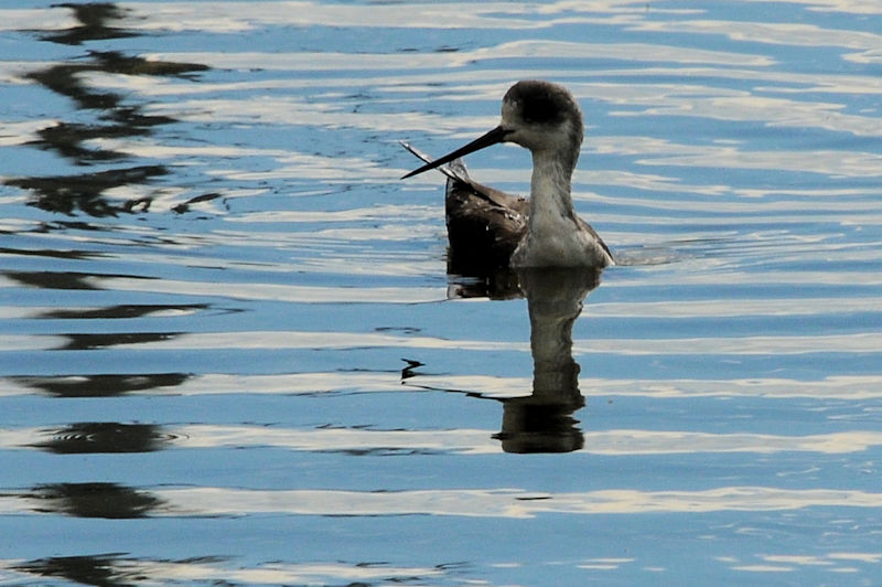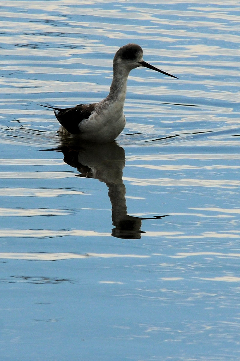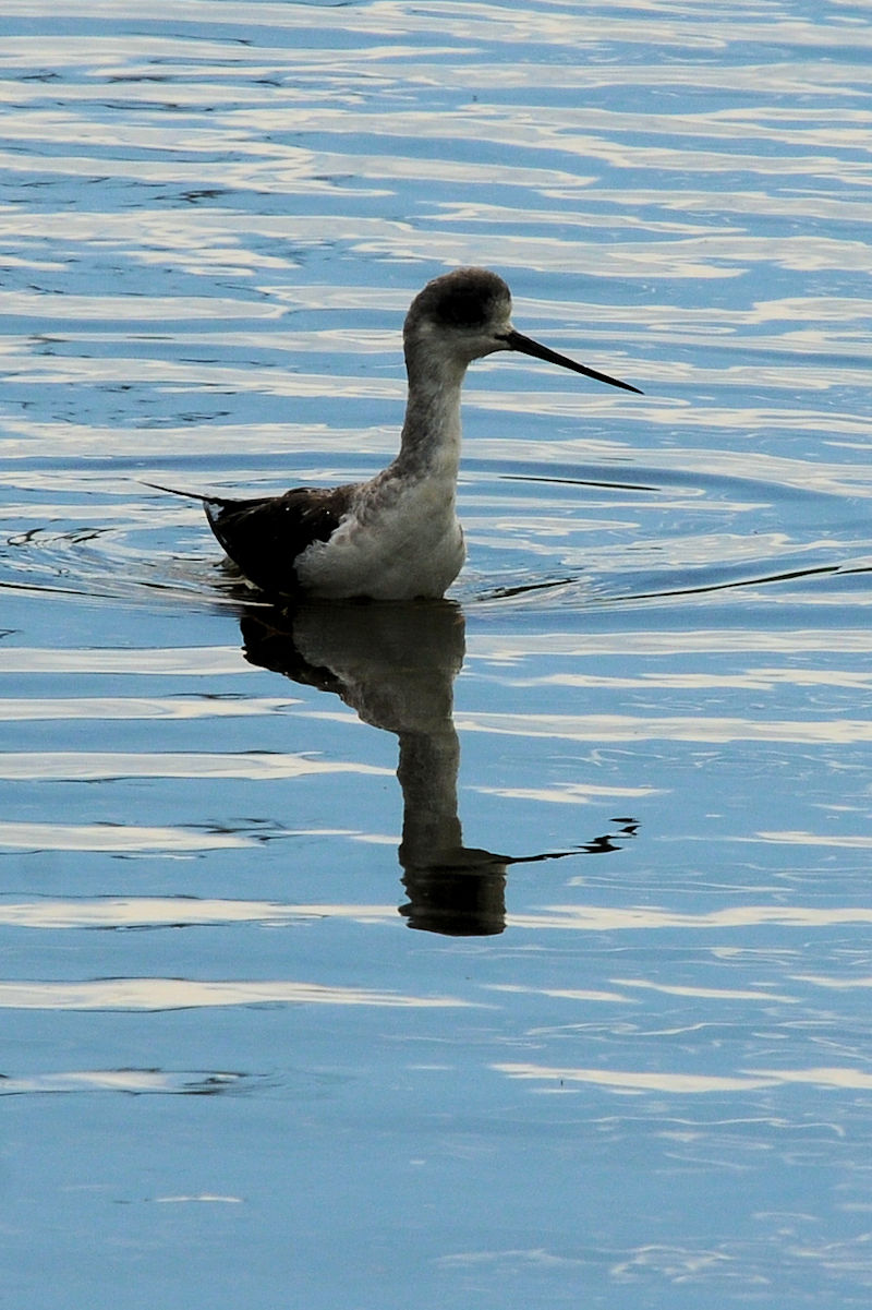 はじめはセイタカシギが泳いでると思ったがそうではなかった。深みにある餌場から浅瀬に歩いて帰って来たようだ。