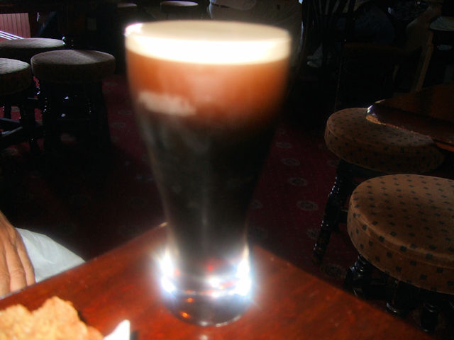 私は、出来たものと思って、そのコップを持って帰っていたら、不意に横から呼び止められた。見ると、先ほどのおばちゃんが友人らしき人とテーブルを囲んでいたのである。気がつかなかった。 おばちゃんは、それはまだ駄目、カウンターへ持って行きなさいという。私は何のことか分からなかったのであるが、ともかくカウンターに戻ってコップを置くと、先ほどのボーイがギネスを注ぎ足してくれたのである。 これで納得した。最初に注いでから、泡が消えるのを待って、さらに規定の量まで注ぎ足すようである。おばちゃんは、私のコップの量を見て、気がついたのだろう。私がアルコールに弱いことや、ましてや、ギネスに詳しくないことなど、すべてお見通しであったのだろう。