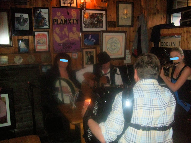ライブが始まるようだった。残念ながらテーブル席では壁越しで、姿は見えない。仕方なく、ギネス片手に立ち見覚悟で移動した。 それが、どこのライブもそうであるが、マイクの調整やら何やらで、なかなか始まらないのが常である。 下手をすると一時間ほど待たされることがある。そういうこともあって、たまたま、帰る人があって椅子が空いた。 目の前に、おばちゃんがバウロン を持って座っている。ギターをもった男がリーダーのようだったが、ときおりおばちゃんと言葉を交わしていた。そこへフルートをもった綺麗なお嬢さんと、アコーデオンを肩にかけた男も加わった。