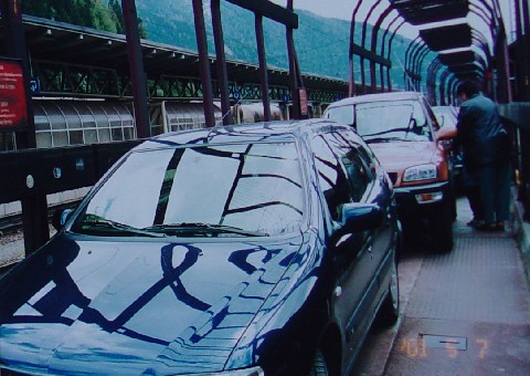 ところが、よく見ると、カーフェリーのように、係員が車を列車に誘導しているではないか。助かった。そのまま車の列に並ぶことにした。係員の指示通りに車を貨車に載せると、一旦車から降りて、連結している客車の方へ移動する。