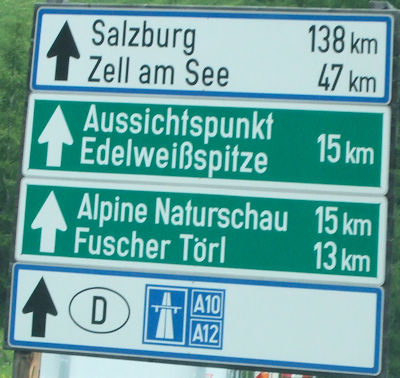 緑の地色に白抜きの地名にある、フッシャー・テール Fuscher Törl や、エーデルワイス・スピッツェ Edelweiss-Spitze は、このホーヘ・タウエルン国立公園 Hohe Tauern Natiomal Park 内にあるということを表しており、それは即ち、この山岳道路沿いにあるということになる。