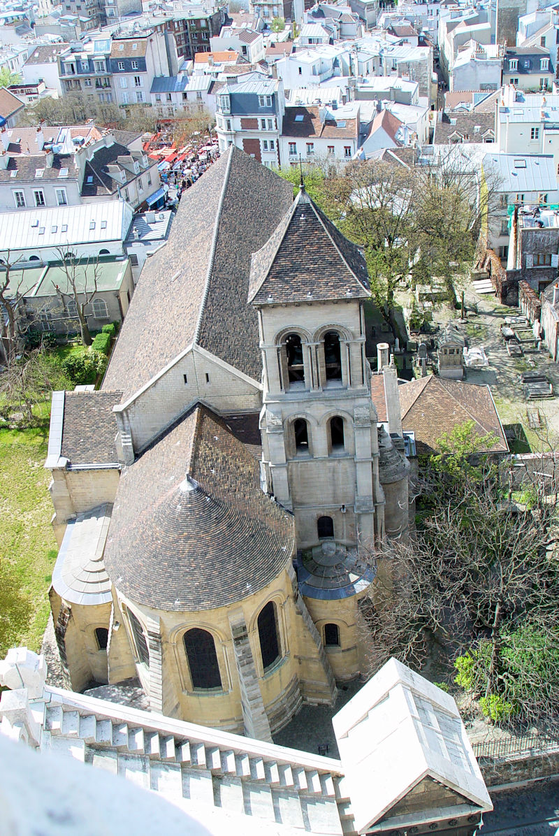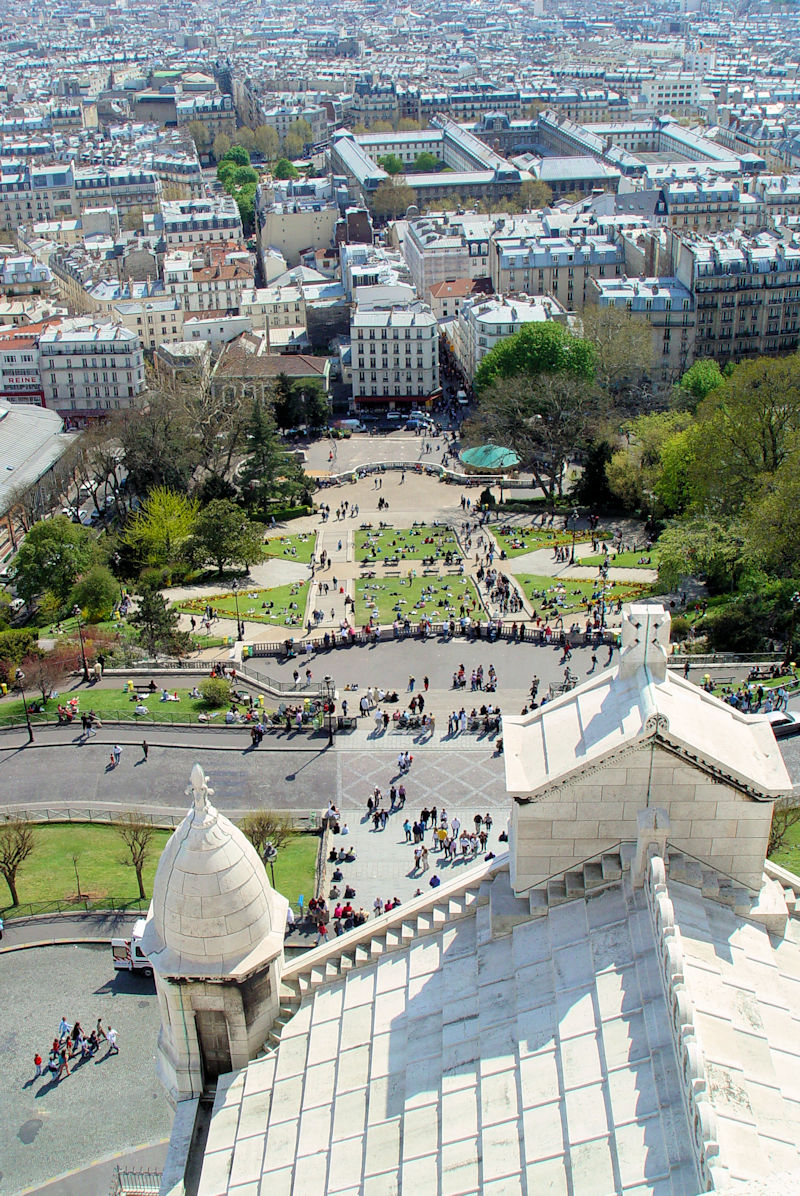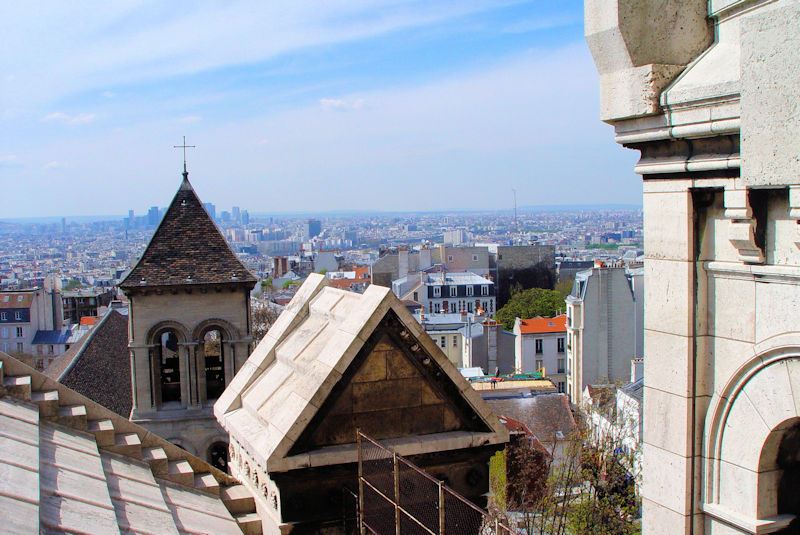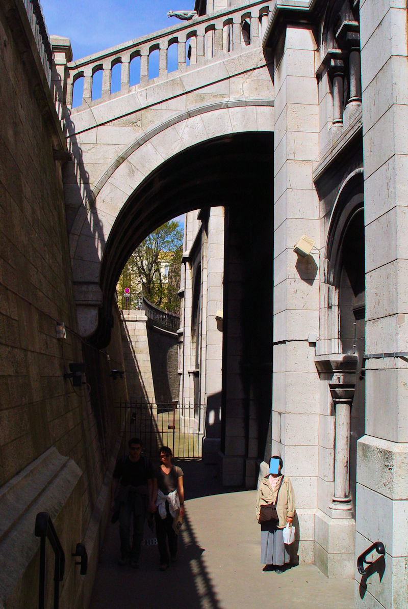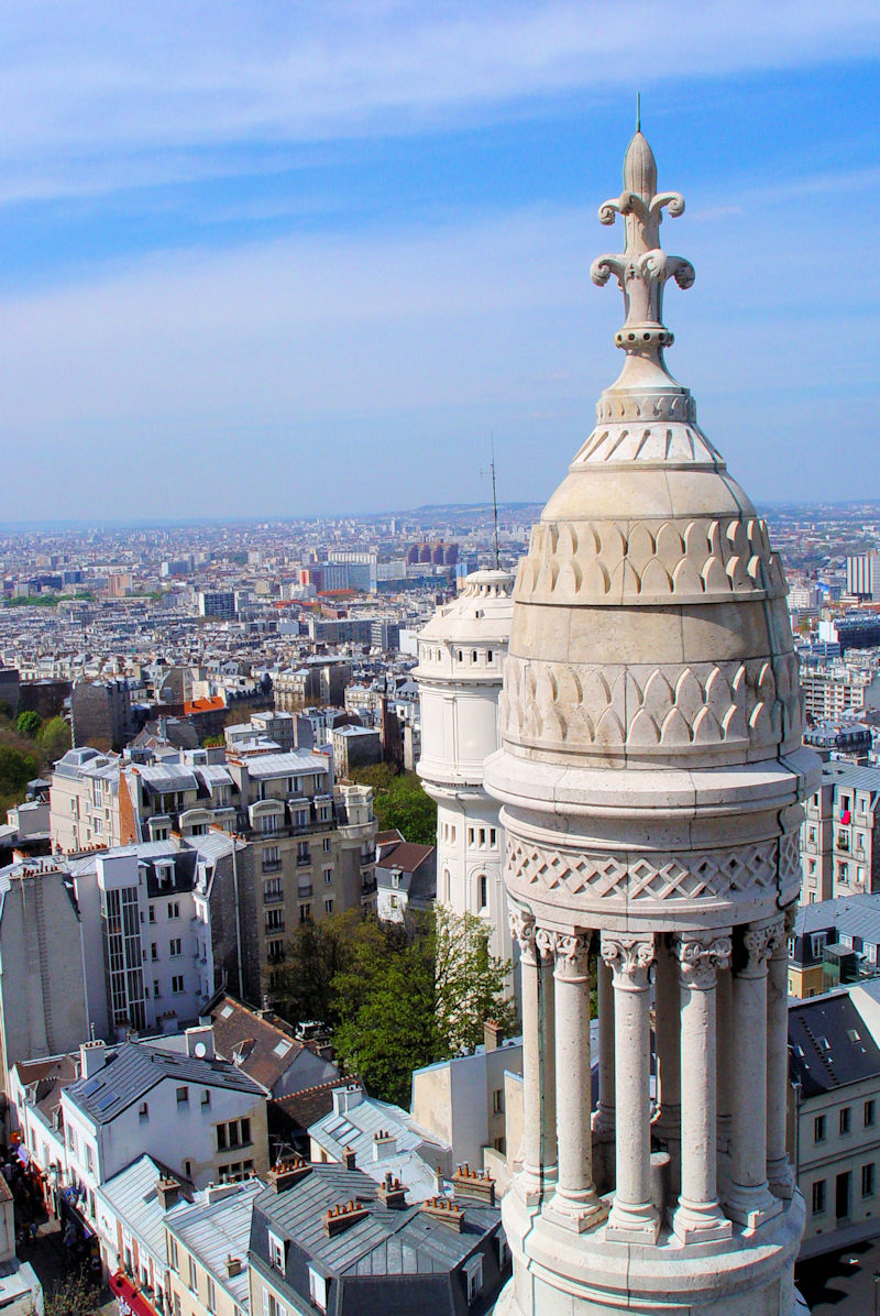 サクレ・クール大聖堂のドームに上る サクレ・クール大聖堂のドームに登れると知ったからには、例のごとく、高いところへは行かねばなるまい。だいたい、この大聖堂自体、山の上に在るから、 80m 上がったところで見た目が変わる訳ではないであろうが、少なくとも、視界を遮る木立や建物からは開放される。そこが良い。 パリを一望できるというものだ。 cf. 高いところが好きなわけ パリを一望出来るということは、パリのどこからでも、このサクレ・クール大聖堂が見えるということになろう。エッフェル塔と並んでパリのシンボルと呼ばれる所以 ゆえん である。 cf. サクレクール遠望