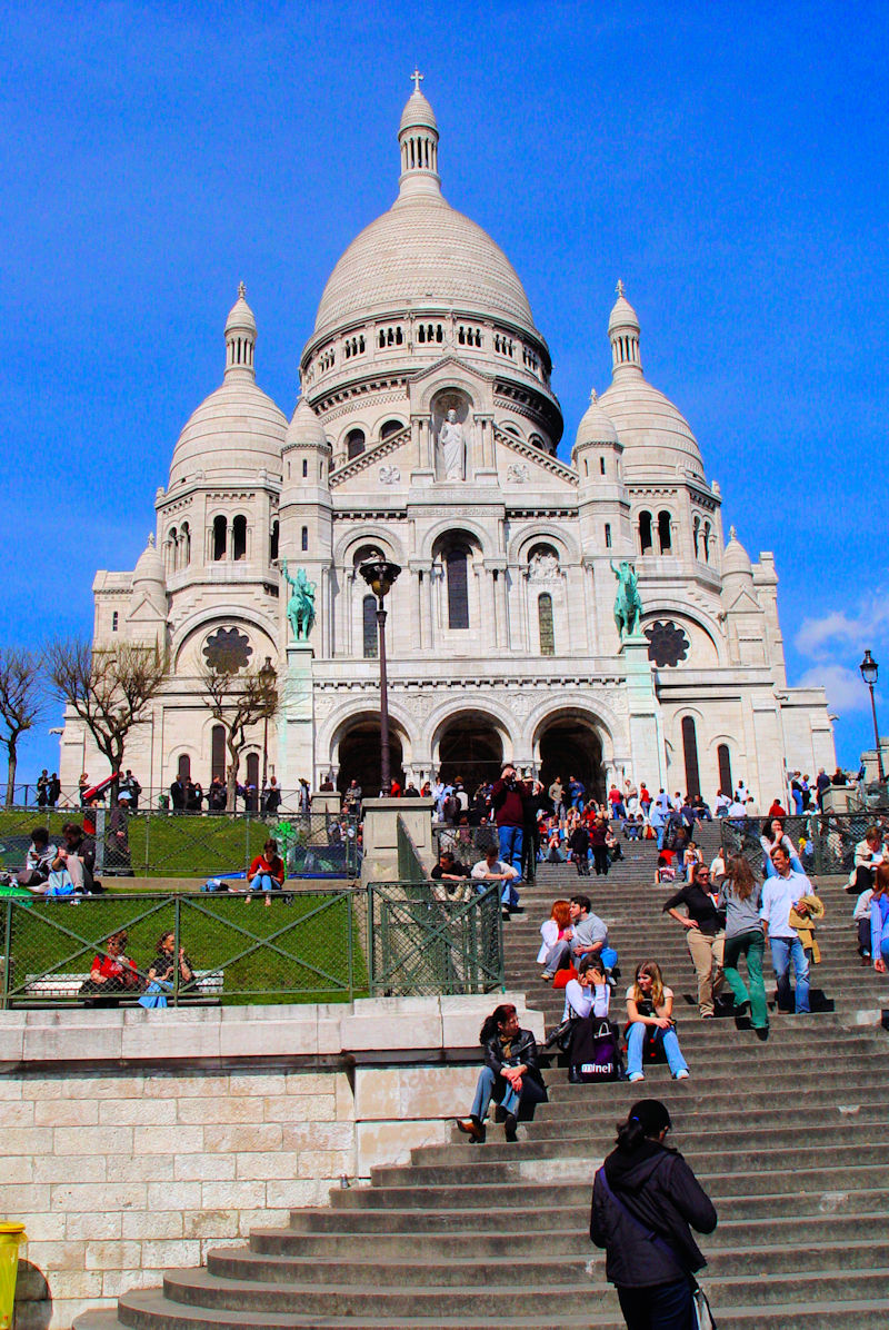 マドレーヌ教会からメトロ (地下鉄) でモンマルトル方面へ移動、サクレ・クール大聖堂へ向かった。映画 「アメリ」 で有名になったかも知れない。とにかく丘の上まで無駄な労力は使いたくないから、フニクーレ Funiculaire (ケーブルカー) に乗った。 男山のケーブルカーほどの距離である。 サクレ・クール大聖堂は、ここからのパリの眺望が一番ということもあって観光客でいっぱいであった。ただ眺めが良いと言うのではなく、大階段があり、それが腰を下ろすのに丁度良いのだ。 cf. ノートルダム大聖堂 cf. サクレ・クール大聖堂 cf. リスボン大聖堂 cf. サラマンカ新大聖堂