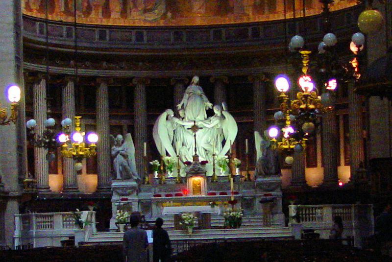 この辺りは、観光客と地元の人たちも加わり、まさに繁華街の様相で、教会の石段は、若者たちの待ち合わせや、独りで本を読むものもいたりして、憩いの場になっているようである。 教会の中にも自由に入れるようになっていた。中の礼拝堂も、大聖堂のごとく立派なものであった。といって、教会も大聖堂も、どこが違うのか良く知らない。ただ、私は、大きさで判断しているだけでけである。 ここで、エッフェル塔へ先に行くか、サクレ・クール大聖堂へ先に行くかということになり、とにかく、ラデュレ に入って、腹ごしらえをしながら決めることにした。