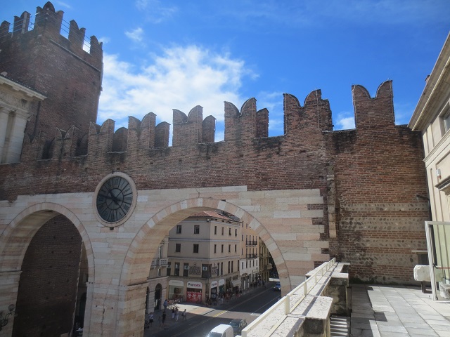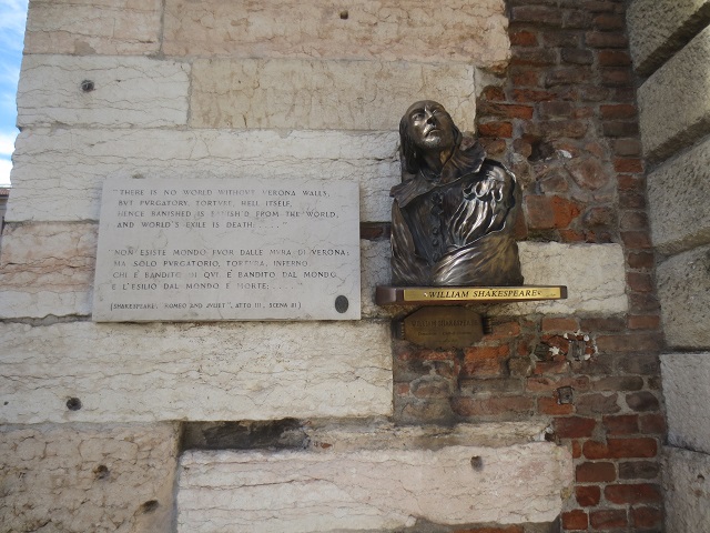 ブラ門Portoni della Braの右側の柱に下にシェイクスピアの胸像が置かれている。シェイクスピアがヴェローナを訪れたことはないようだが「ロミオとジュリエット」の舞台理由は何か興味があった。ブラ門の中央上部には時計がある。