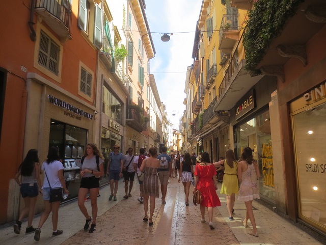 ヴェローナ旧市街の目抜き通りの賑わいは尋常ではない・・・それだけいいものを持っている証であろう。ヴェローナ旧市街は2000年に世界遺産として登録された。