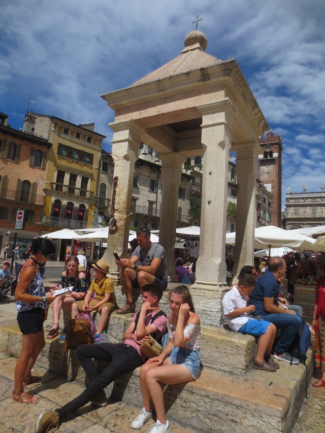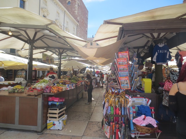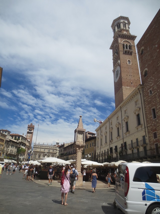 目抜き通りを抜けるとエルベ広場Piazza delle Erbeが現れた。名前の由来は野菜 (Erbe) の市場だったからだという。そういえばパドバにもあった。右に見える搭はランベルティの搭 (Torre dei Lamberti)だ。