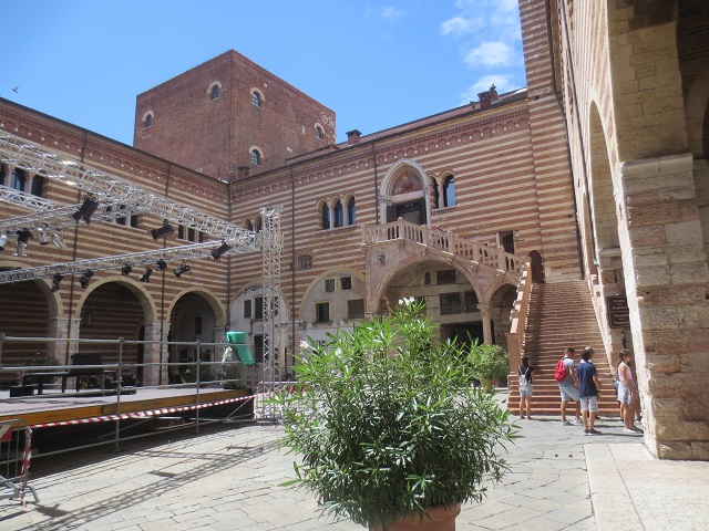 ラジオーネ館(12世紀の市庁舎)の中庭は・・・何かのイベントの演台が組み立て工事中だった。