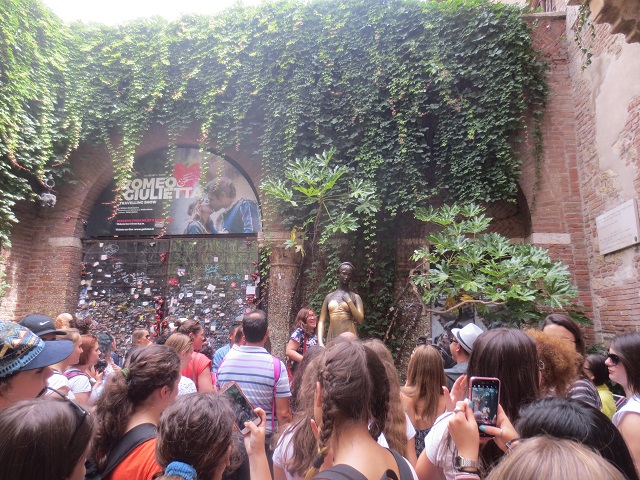 庭に置かれているジュリエットの像に群がる観光客。ジュリエットの像の右胸に触れると幸せな結婚ができると信じられているようだ。