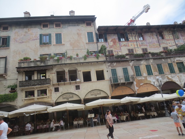 ジュリエットの家を出て・・・再びエルベ広場に来た。正面のマッザンティの家 Casa Mazzantiの壁面には16世紀の伝説を描いたフレスコ画(アルベルト・カヴァッリ作)で飾られている。