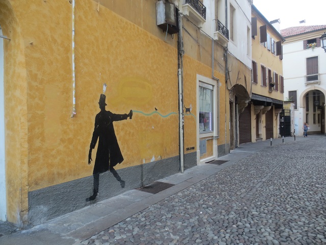よく通りがかりに見かけるこの壁画は・・・この時間帯がいいかも知れない。今しがた見かけた黄金色に染まるラジョーネ宮(サローネ)の姿と重ね合わせて思い浮かべるからだろう。