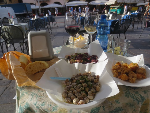 いつものように指差しで注文する。テーブルを借りるために、お隣のお店で赤と白のワインを注文した。両方のお店とも・・・こちらは最早顔馴染み気取りである。