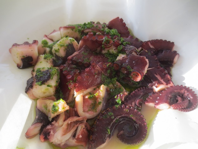 タコを指差し注文すると・・・これぐらいの大きさのもので良いかと鍋から引き上げて見せてくれるのだ。次に、丸のまま食べるか、カットするかと聞いてくれる。野趣味はないが、カットした方が食べやすかろう。