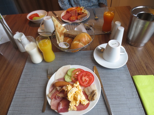 今日は隣町のハル・イン・チロル Hall in Tirolへ日帰り旅行をする。インスブルックから10㎞ほど東にある中世の面影が残る街だ。時間に余裕があるので朝食はいつも通りにゆっくりと・・・