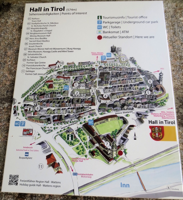 ハル・イン・チロル Hall in Tirol の見取り図 ハーゼック城 Burg Haseggは、図の下方に見える緑色の広場を囲むようにあり、赤丸印が貨幣鋳造所の搭になる。