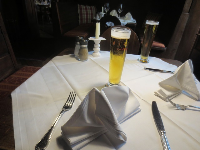 中世風の建屋なので屋内席を希望したがダメだった。ところが急に雨が降り出して、屋内席に移動することになったのである。先ずは、地ビールで乾杯!グラスがおしゃれ!